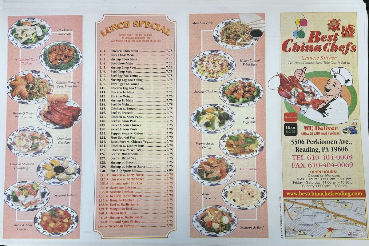 If you’re craving comforting Chinese flavors with plenty of variety, the Best China Chef Menu is where things get exciting. Tucked away at 5506 Perkiomen Ave in Reading, PA, this spot lays out a spread that covers all the classics and then some. From crispy egg rolls and steaming dumplings to rich lo mein and perfectly seasoned fried rice, every section of the menu feels like it was designed to satisfy both quick lunch cravings and full-on dinner feasts.